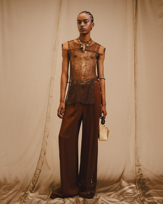 Ochre Gold Textured Silk Trapeze Pants with Suminagashi Organza Pockets & Ostrich Shin details