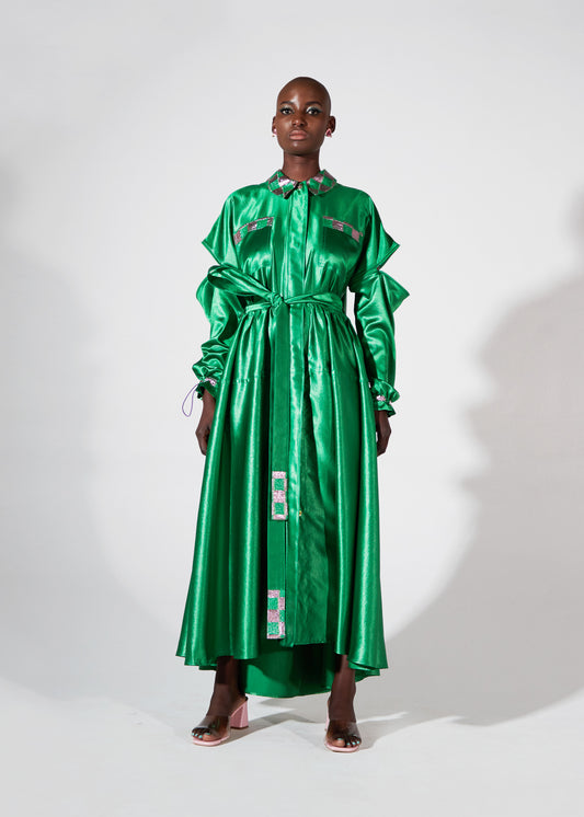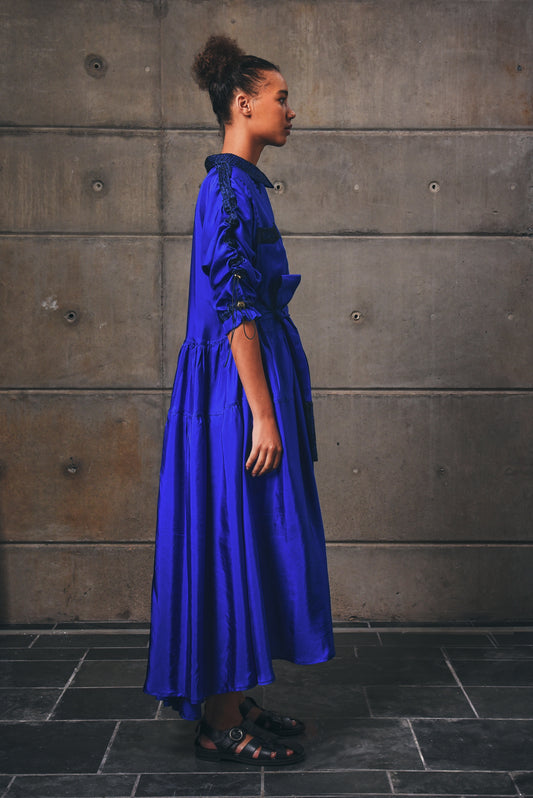 Suminagashi Printed Wool & Satin Signature Maxi Dress with Ostrich Leather Collar