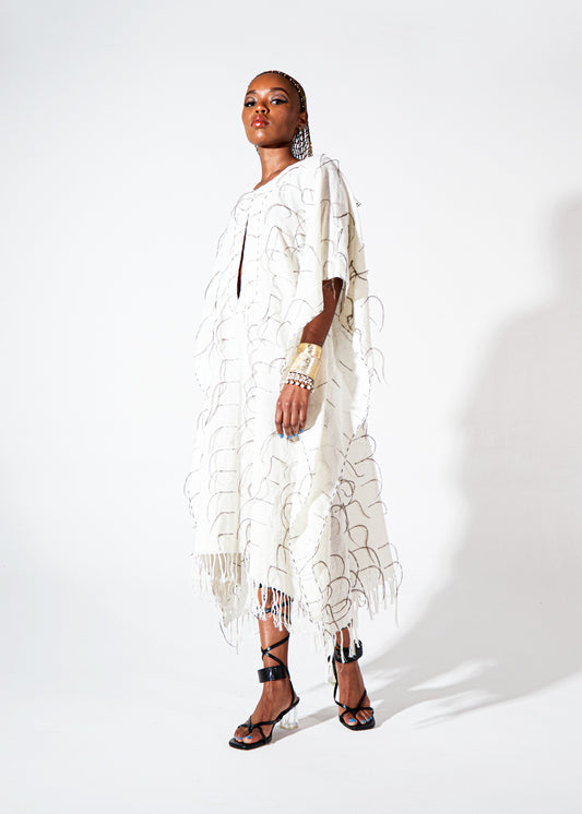 White Organic Hemp Cargo Pants with White Silk Lame Detachable Pockets & Ostrich Shin Details