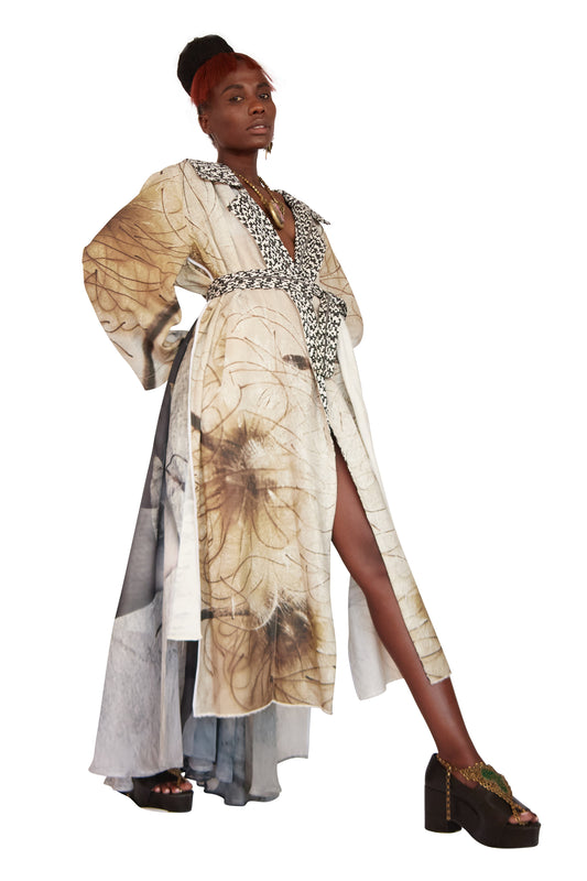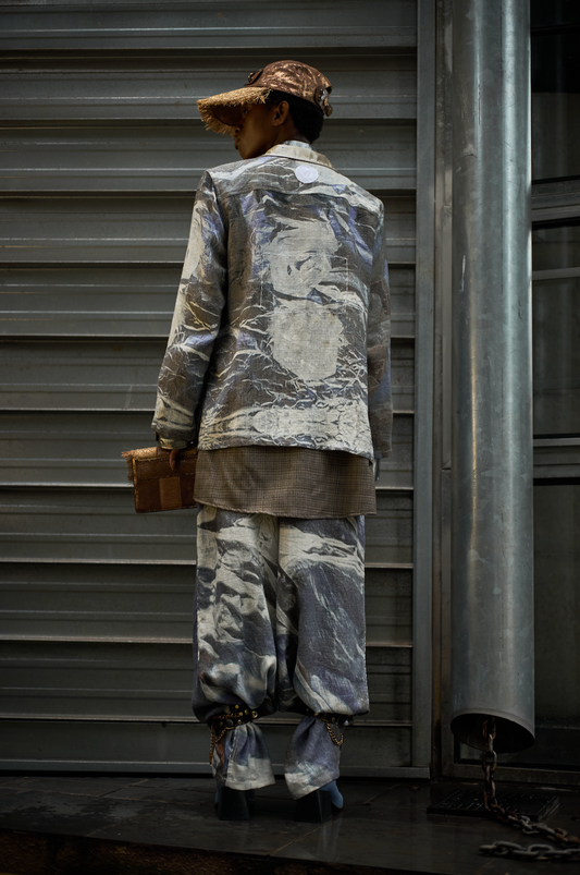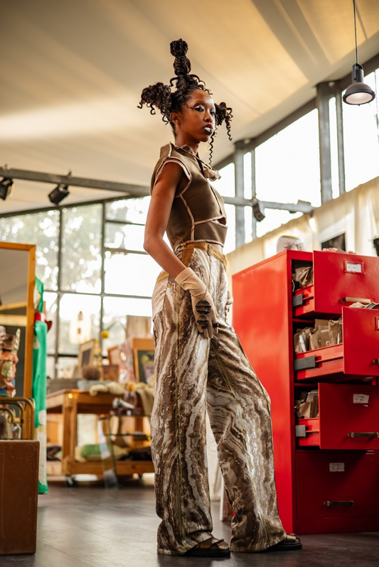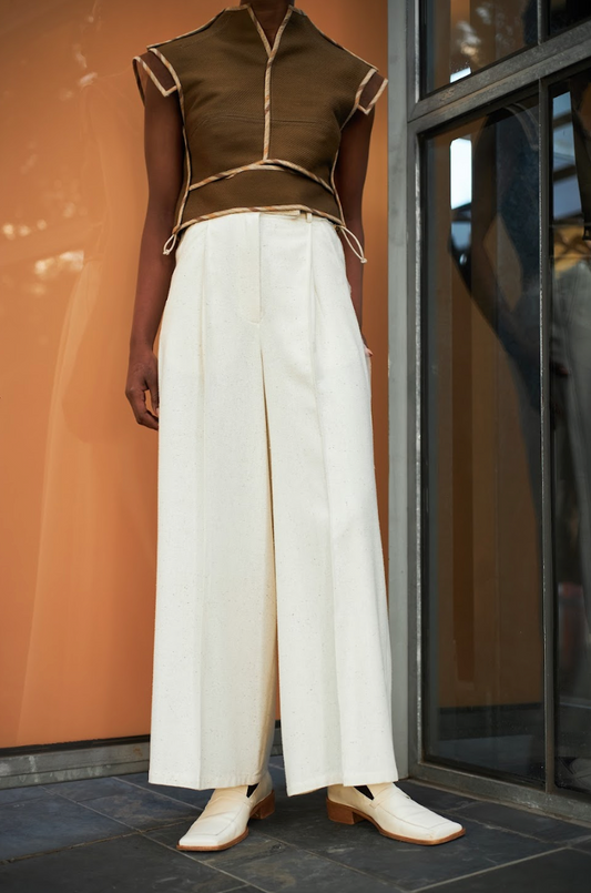Ecru Reclaimed Raw Rough Silk Trapeze Pants with Ostrich Shin details