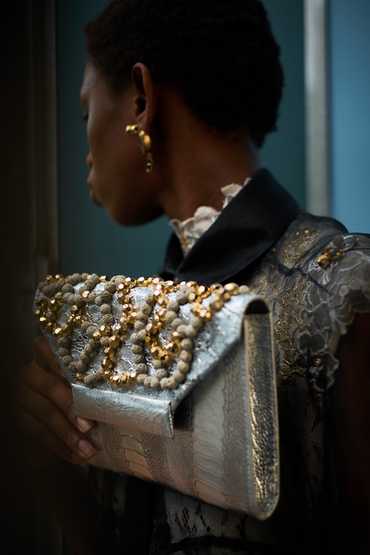 Harlow in Silver Ostrich Leg with Lace and Beading Clutch