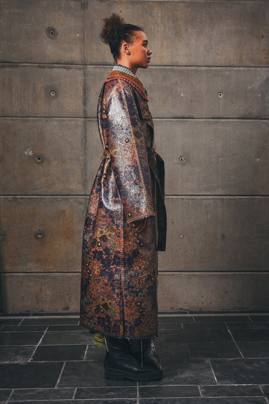 Copper Mothership Disc Arched-Leg Pants in Deadstock Silk Lame