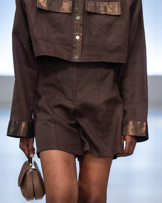 Dark Brown Linen Signature Shorts with Bronze Lame Detail