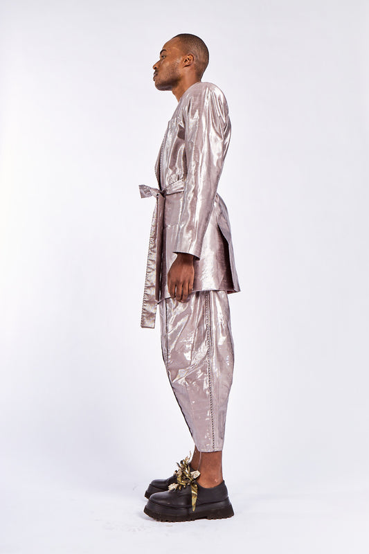 Speckled Wool Wide-Leg jumpsuit with Raw Silk collar & lapels