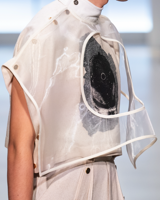 Screen-printed Light Weight Ecru Reclaimed Raw Rough Silk Popper T-Shirt with Zibbon Panel