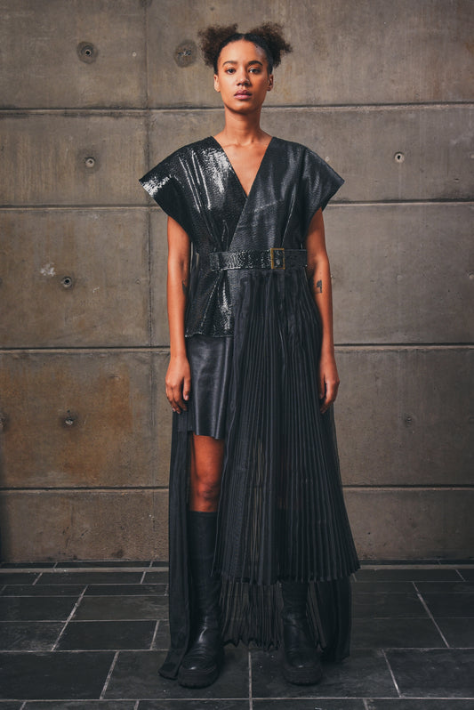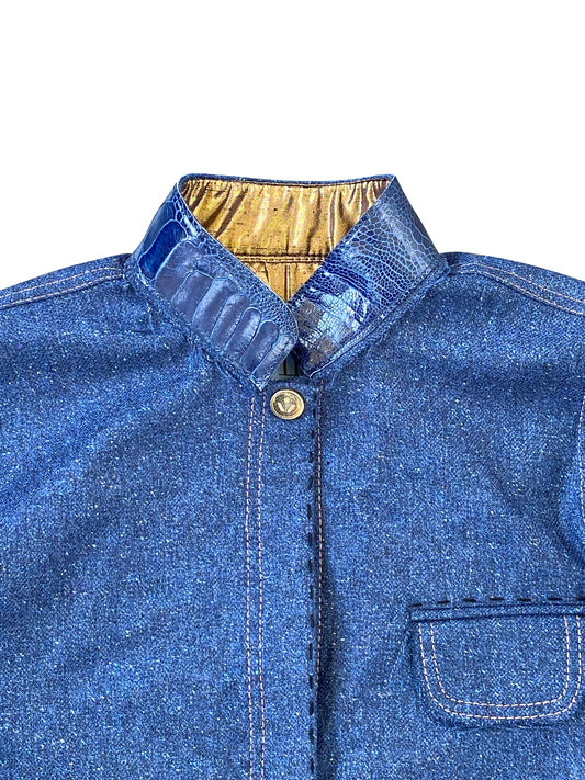 Speckled Wool Shirt with Ostrich Leather Shin Mandarin Collar