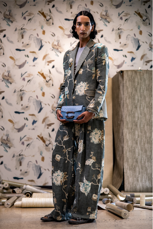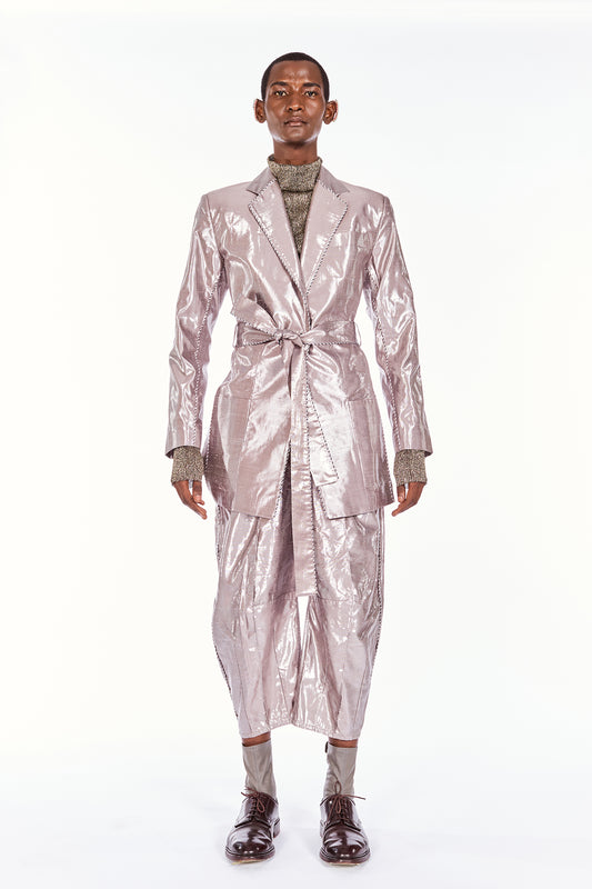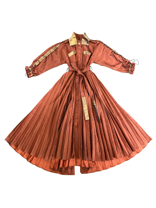 Iron-Ore Accordion Pleated Signature Maxi Dress in Deadstock Synthetic with Hand Embroidery Stitches