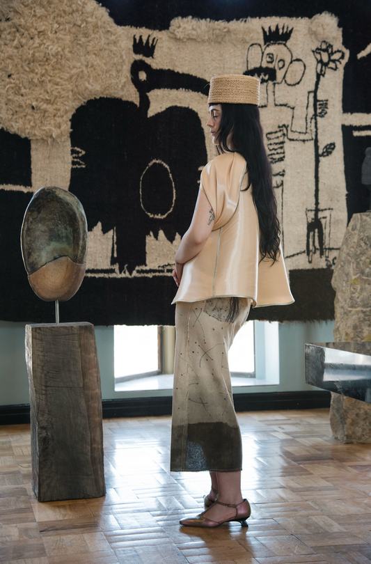 Suminigashi Textured Silk Sculpted Sleeveless Pintuck Shirt with Couture Ostrich Feather Cotton and Ostrich Shin Collar