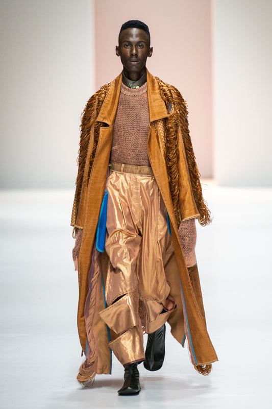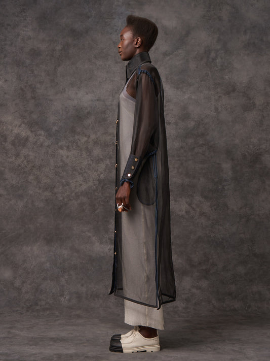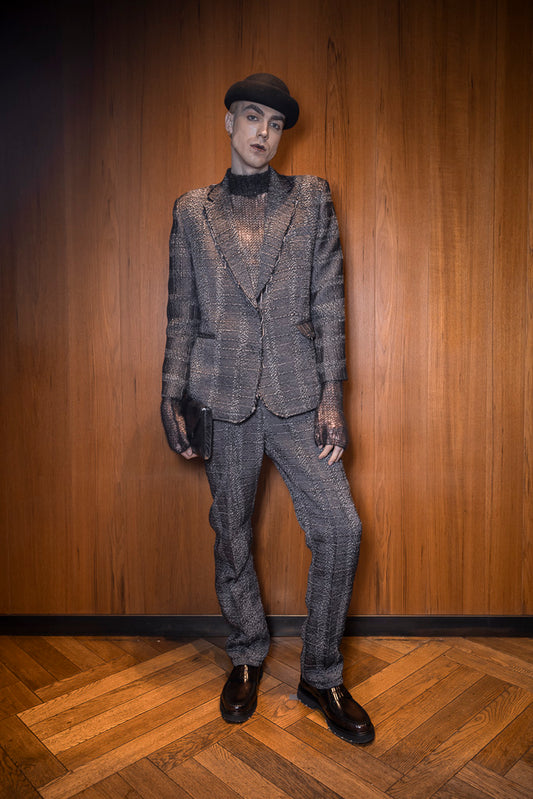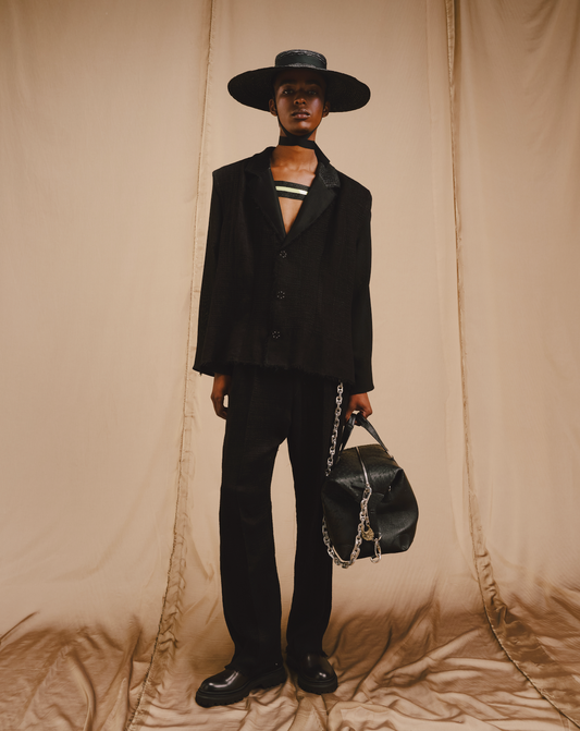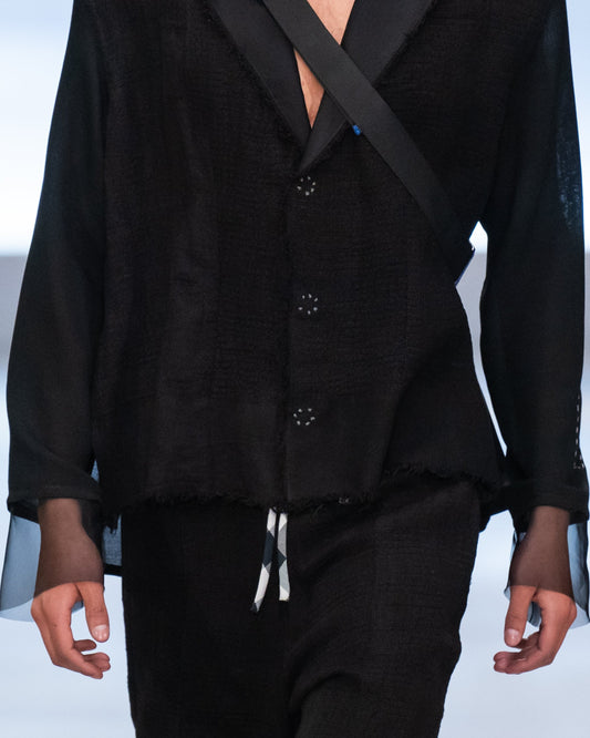 Jacquard Woven Black Bogolan Mud Cloth Oversized Shirt Blazer with Couture Black Wool Silk and Black Crepe Leather Details