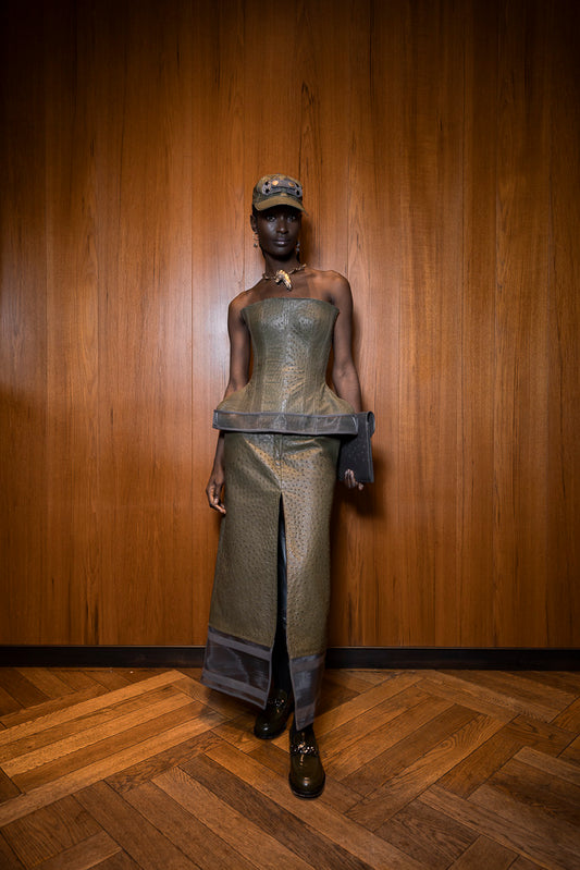 Moldavite Green Ostrich Leather Sculpted Corset with Grey Zibbon Panel
