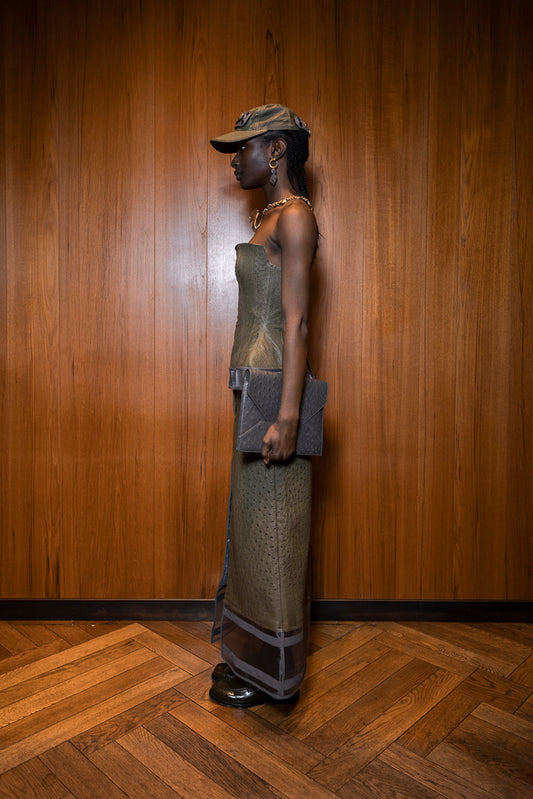 Moldavite Green Ostrich Leather Long Tube Skirt with Grey Zibbon Panel Ostrich Shin detail