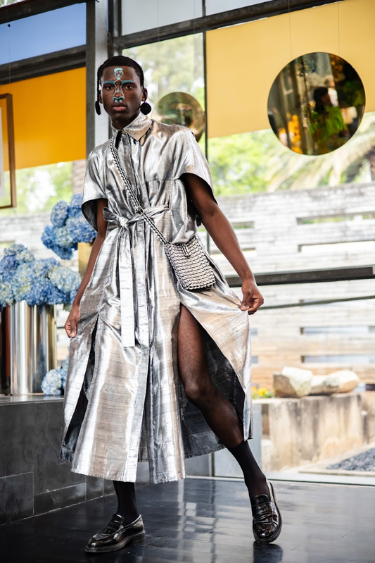 Suminigashi Silver Stripe Nylon Lamé Sculpted Sleeveless Pintuck Dress