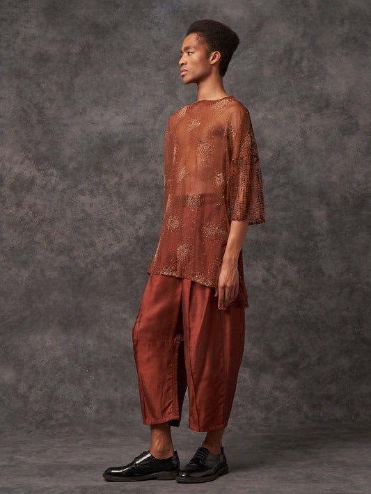 Ochre Gold Textured Silk Trapeze Pants with Suminagashi Organza Pockets & Ostrich Shin details