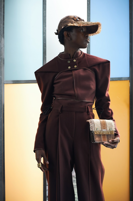 Brown Shimmer Leather and Raffia Cap with Ostrich Shin Tabs
