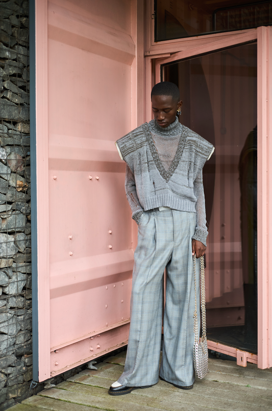 100% South African Merino Wool Suiting Cloudy Sky Plaid Trapeze Pants