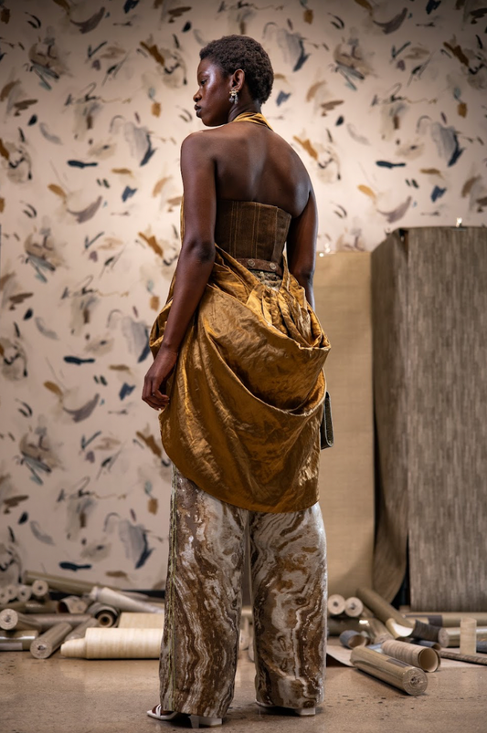 Mistra Soft Gold Linen Halter Neck Drape Dress