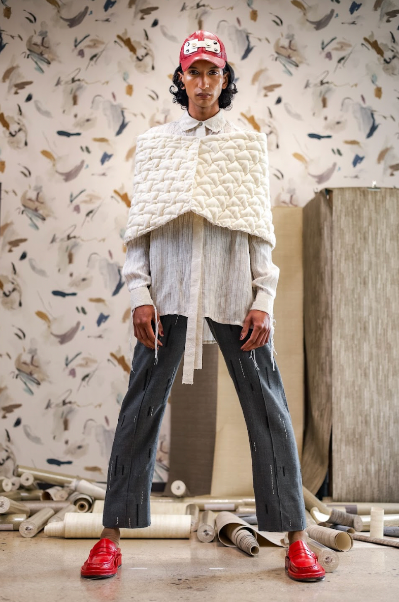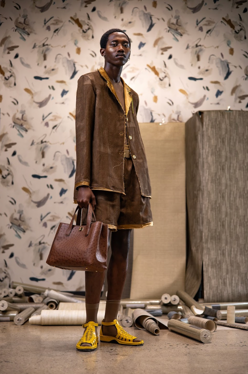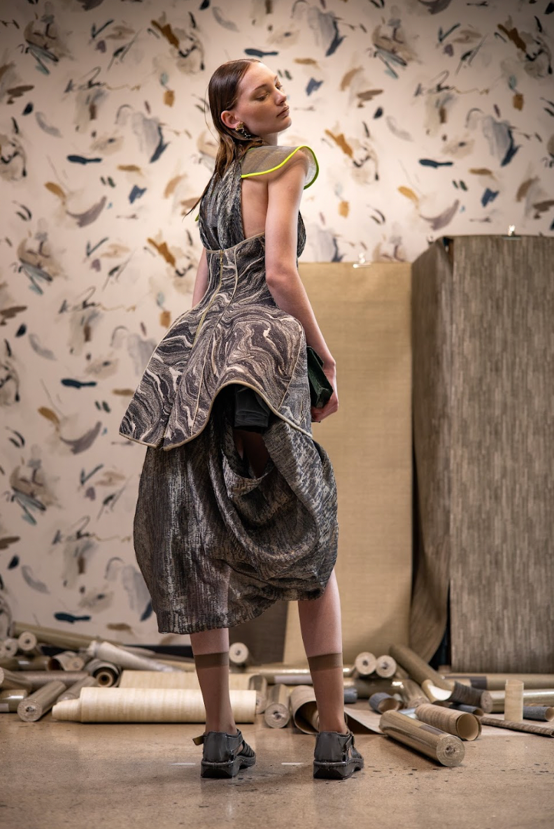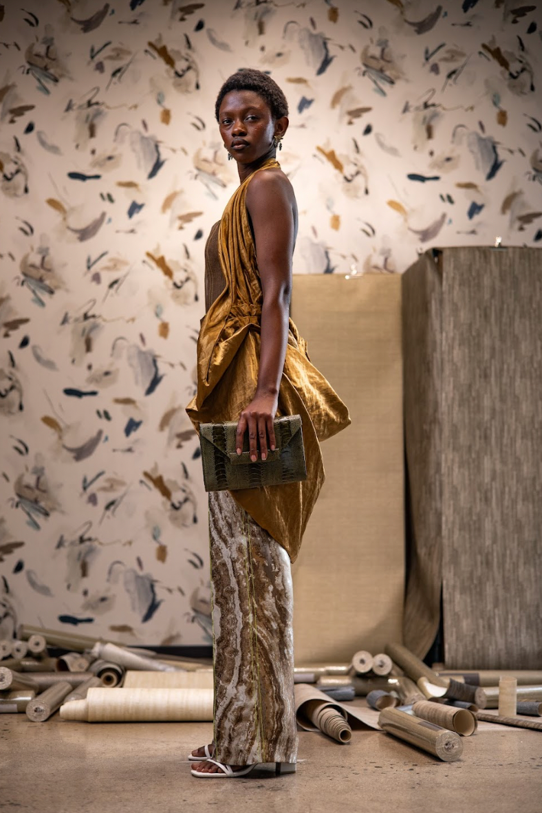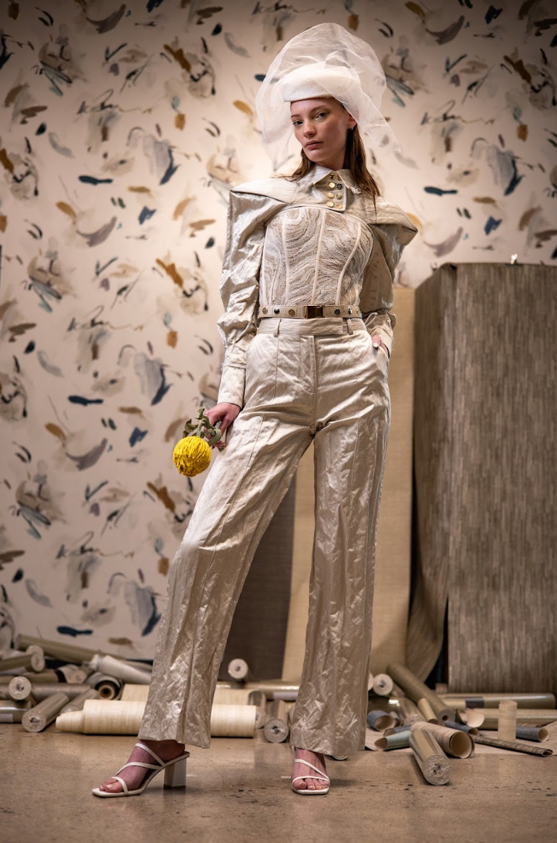 When luxury interiors meet avant-garde fashion, fabrics move beyond the home into bold, tactile works of art. Sculptural silhouettes play with contrast: soft and structured, classic and experimental, grounded in natural fibres and a shared devotion to artisanal craft. Here, a jacket may carry the DNA of a chaise longue; a dress the essence of a wallpaper’s pattern. Each becomes part of a new cultural exchange between ROMO and VIVIERS.