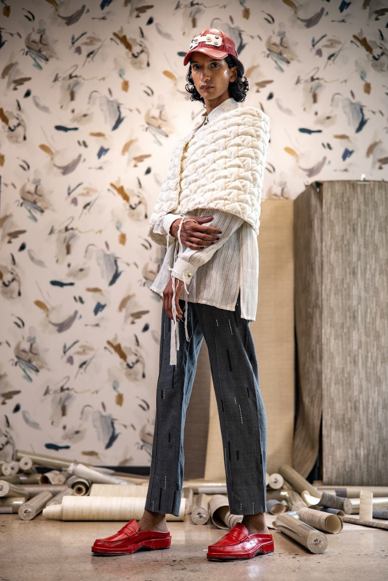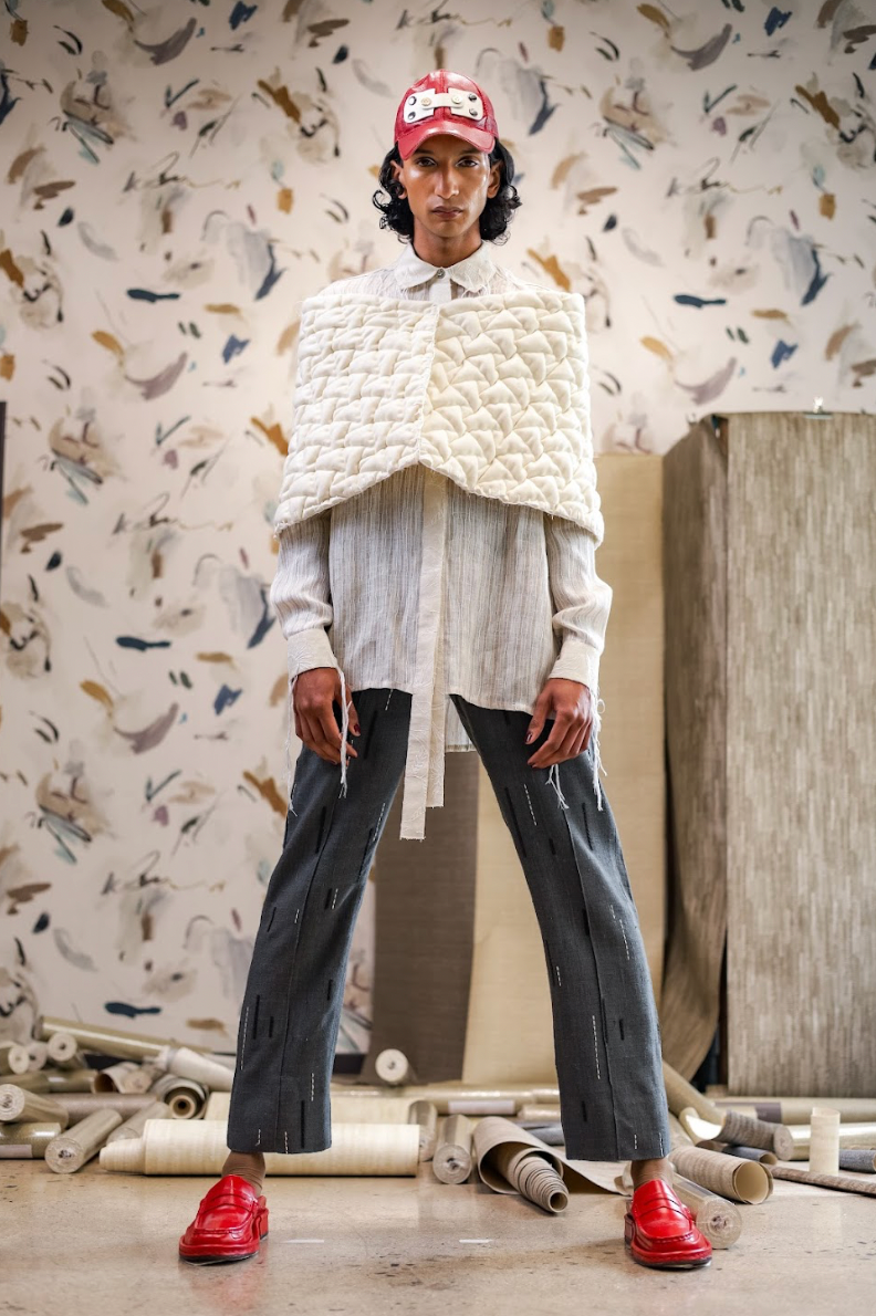 Our Area Chalk Wool-Acrylic Sculptural Shawl Cape is crafted in suiting with a voluminous, architectural silhouette. The cape features intricate hand embroidery, adding artisanal detail to its clean, sculptural form