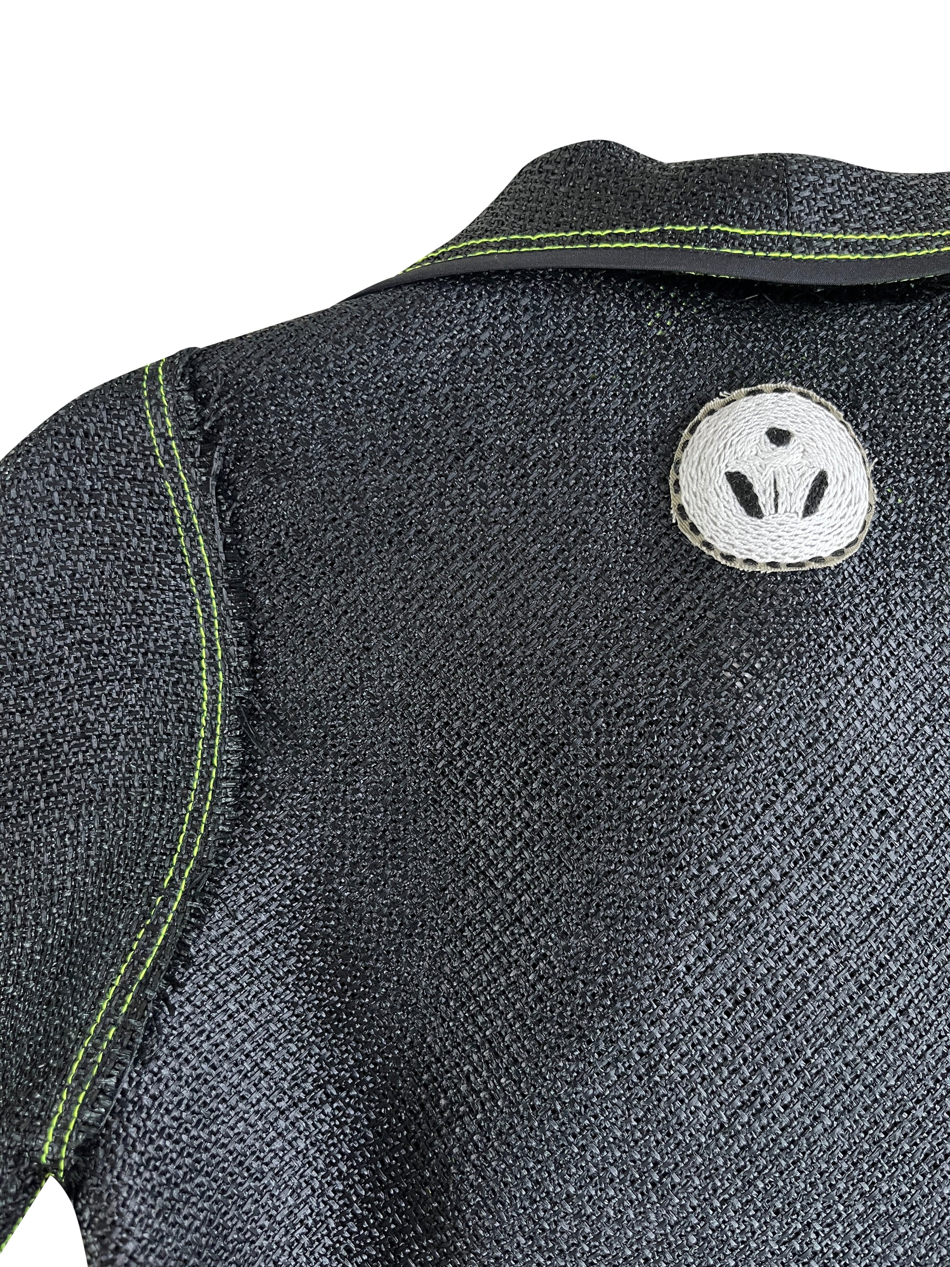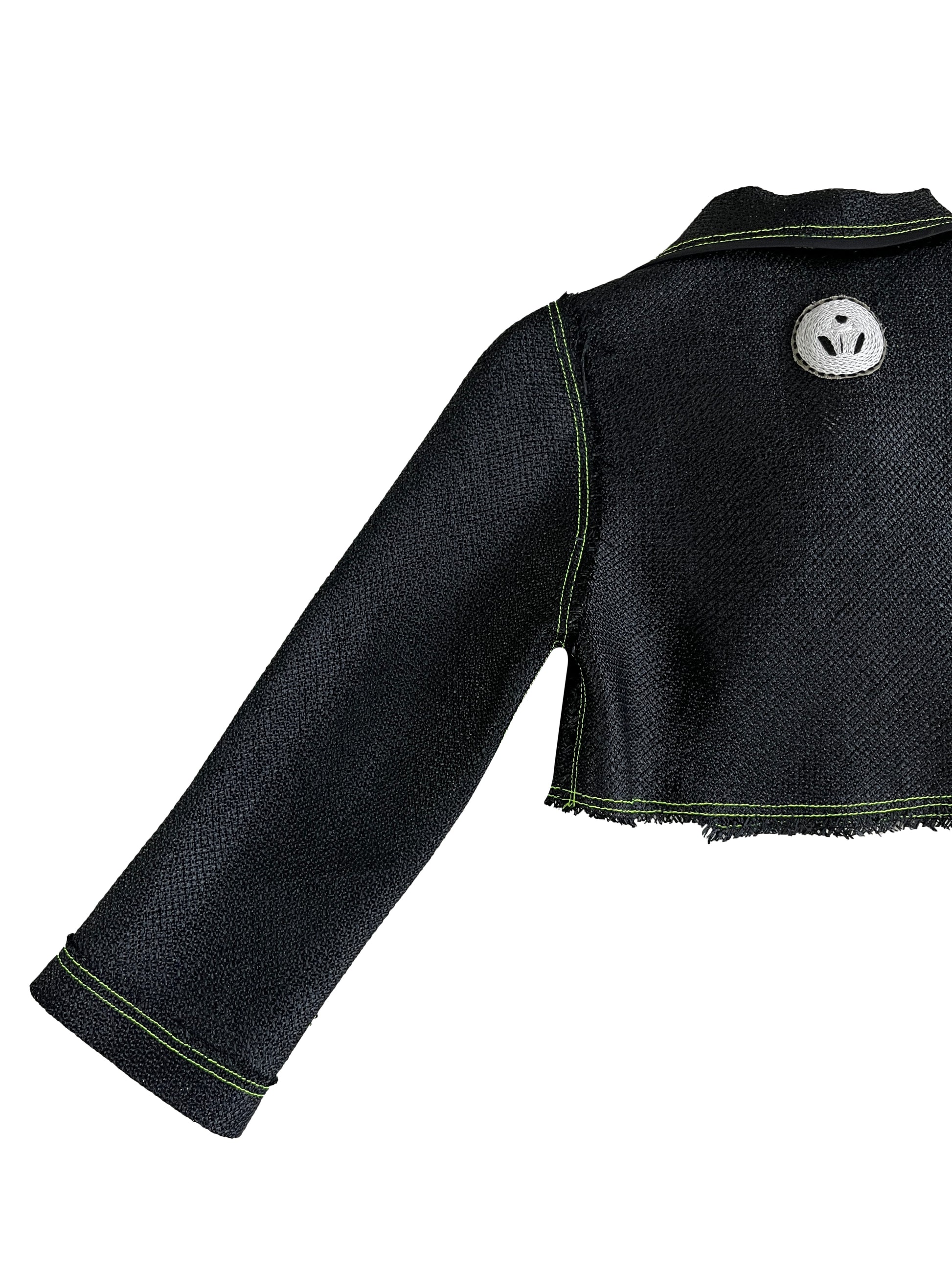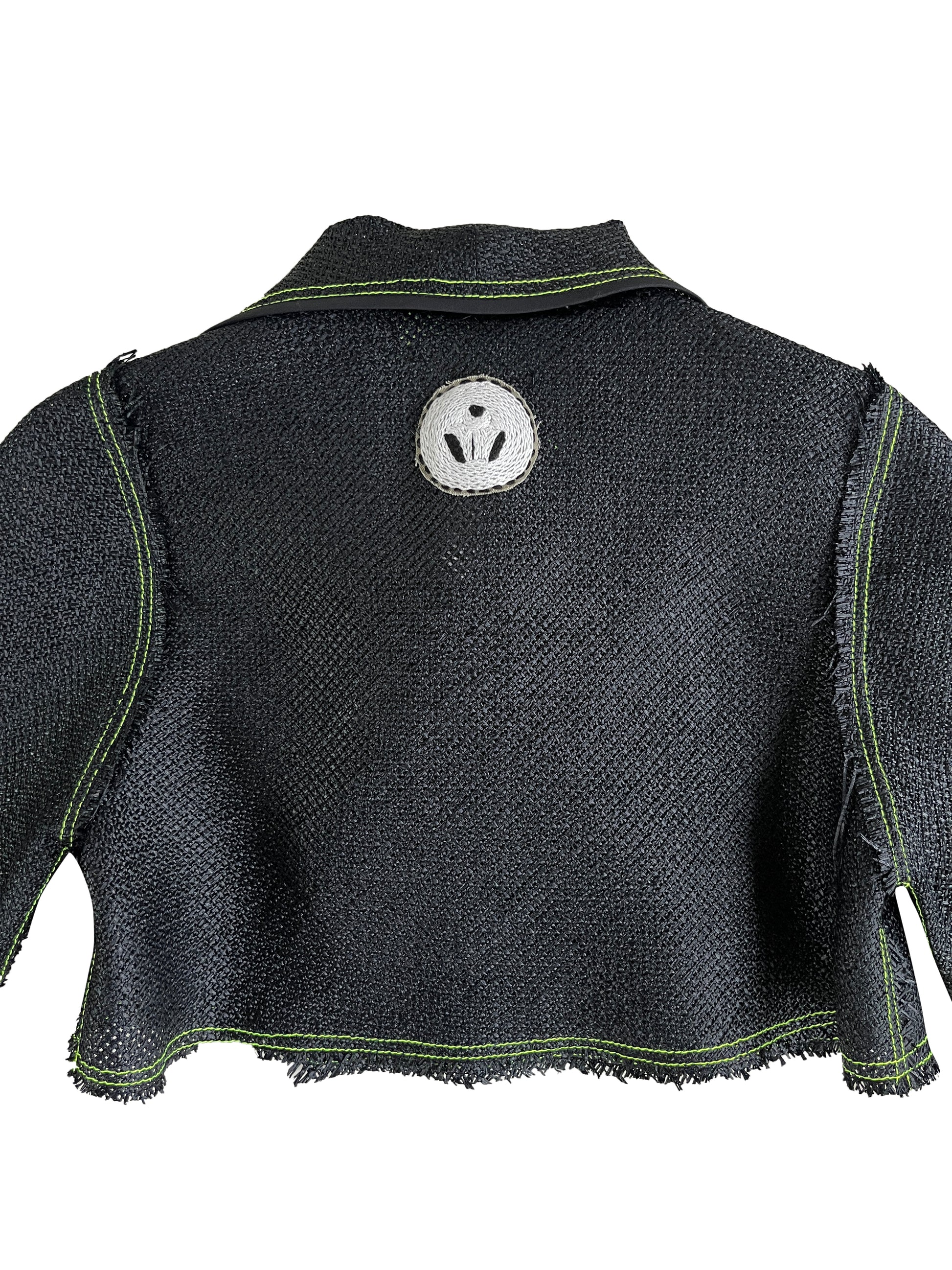A raffia cropped biker jacket with contrasting top stitching, a collar and lapel, hand embroidered logo on the center back, long sleeves. This closet staple boasts quality and simplicity.