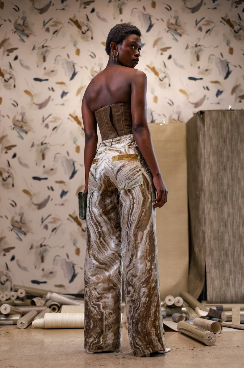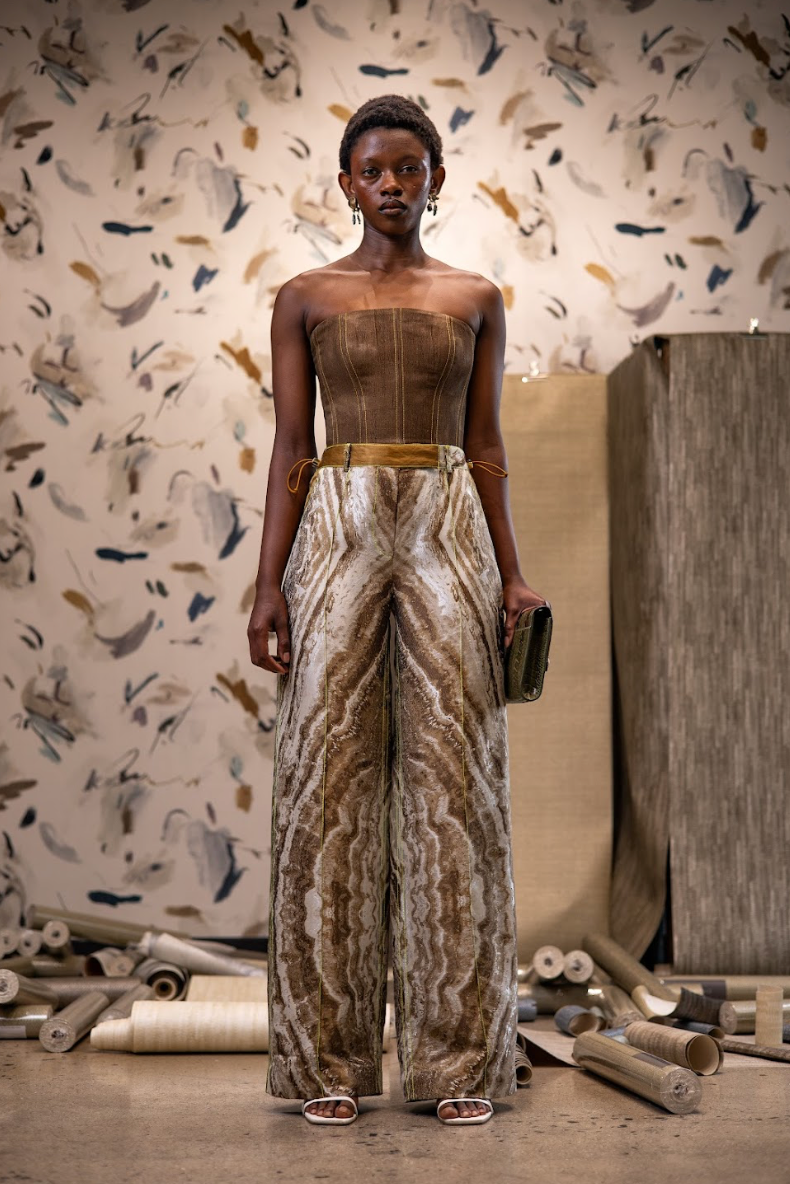 Fabrication: Elgin Cognac Viscose Polyester Blend, Enzo Orient Cotton Polyester Blend, and Dark Brown Acetate Cotton Viscose Twill Lining