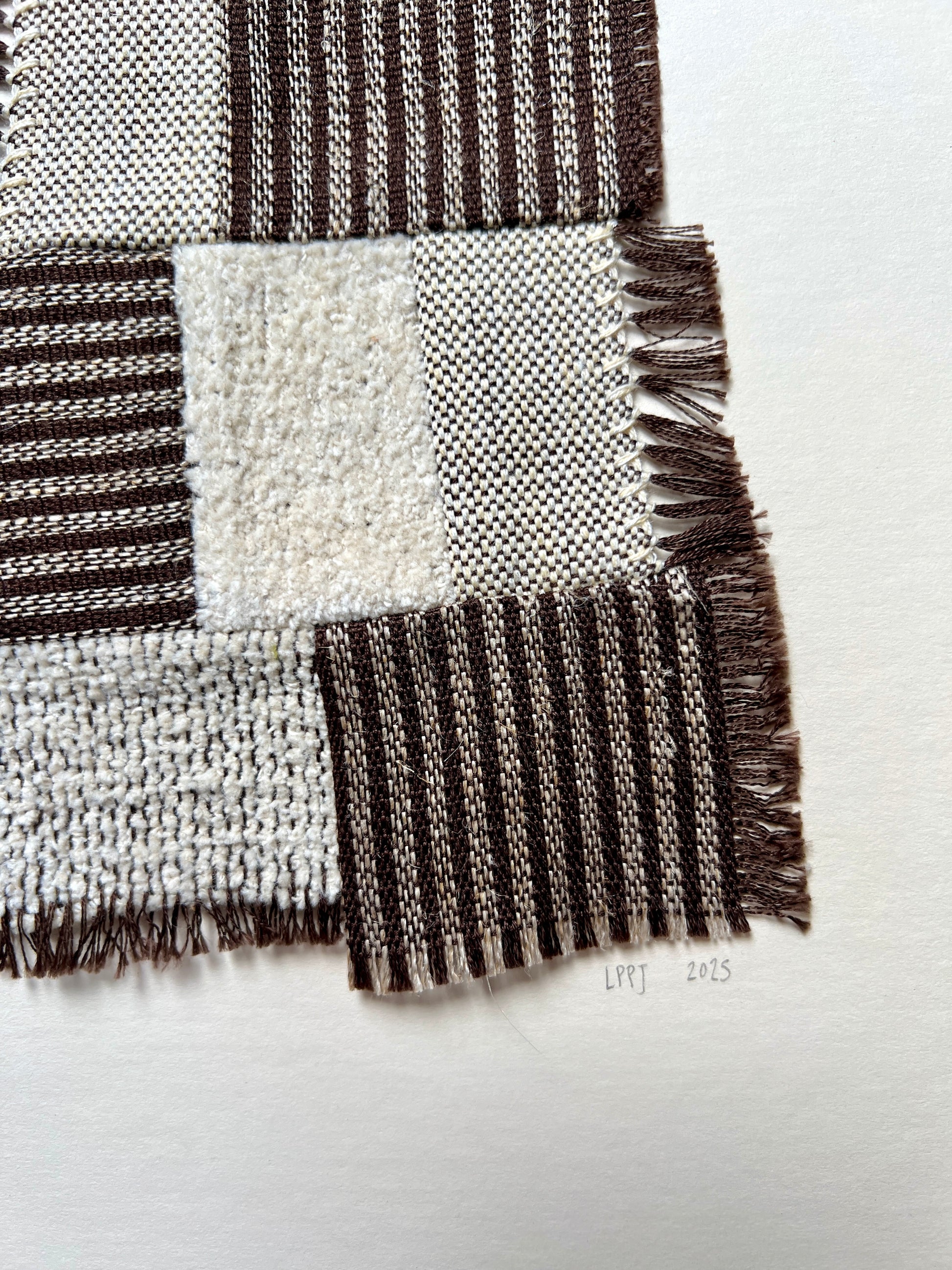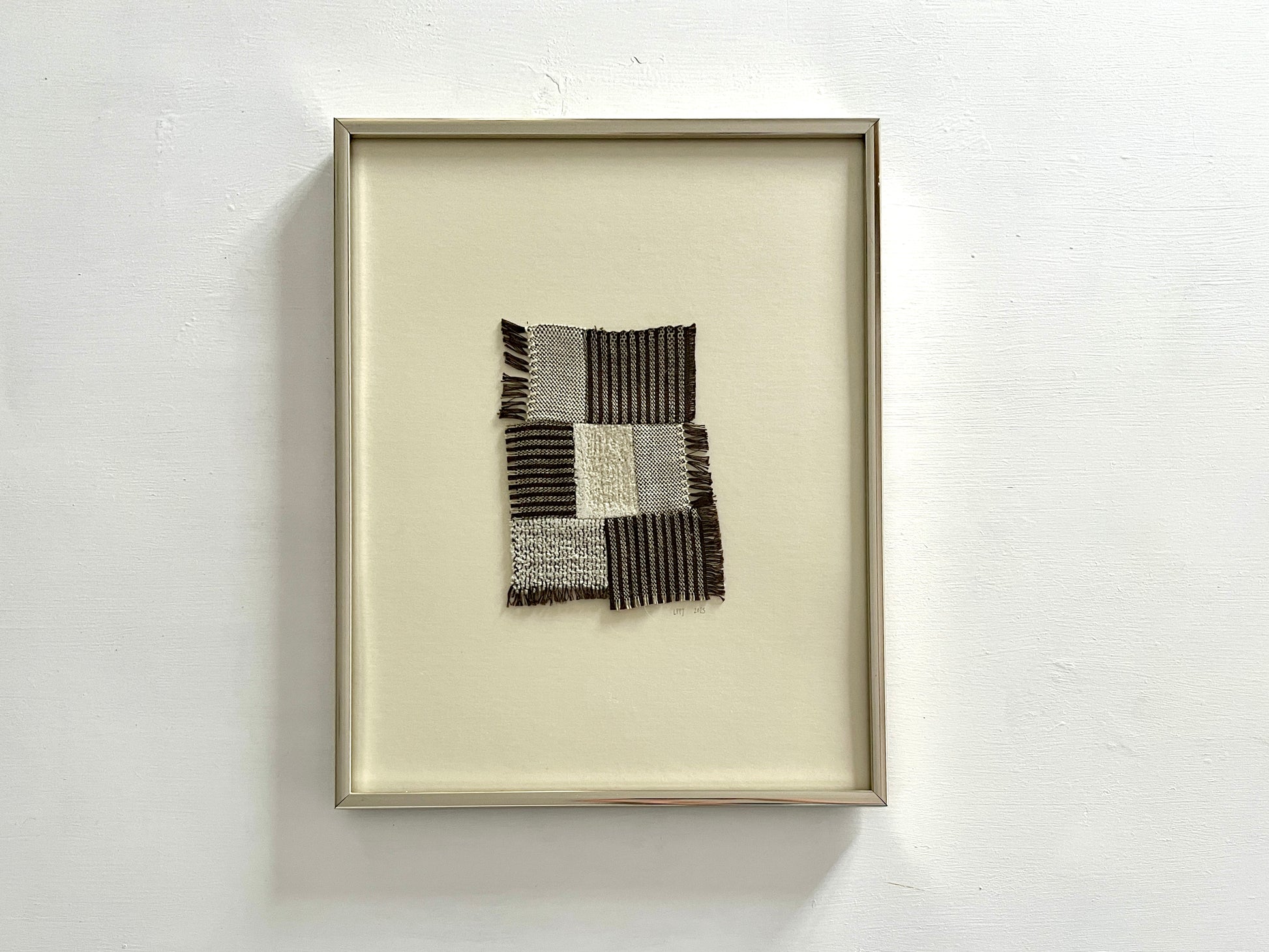 A small patchwork reminiscent of farmland seen from above, made rom small scraps of my handwoven fabric (all linen and cotton). The sides are left unhemmed, and the piece is mounted onto an acid free cream board and displayed in a metal second hand frame (included).
