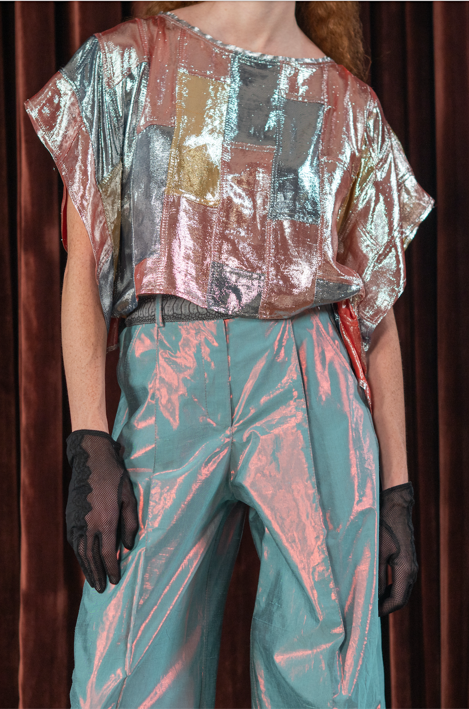 Fabrication: Silk lurex block top made from upcycled fabric scraps.