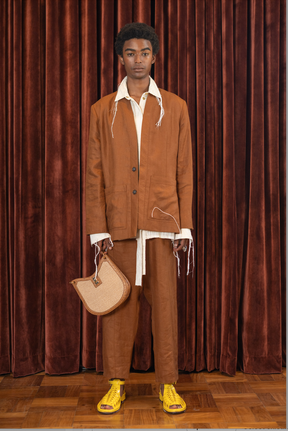 Burnt Sienna Linen Tailored Jogger Pants with Soda Green Acetate Pocket Lining.