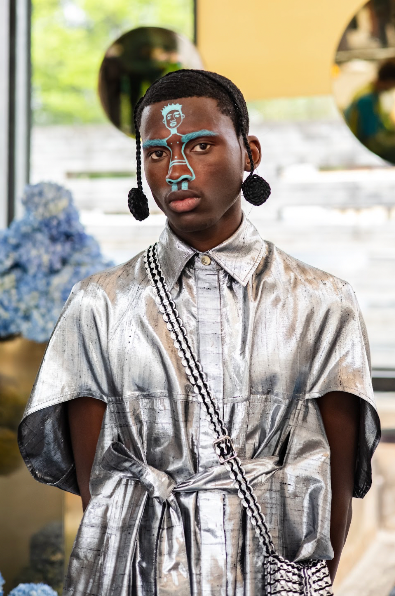 The Mercury Cocoon Shirt Dress is crafted from a vintage silver and black silk lamé blend with dolman sleeves, French seams, and a hand-embroidered label. The dress includes belt holes with a belt that can be tied through the dress to allow for a cinched shape in the front.