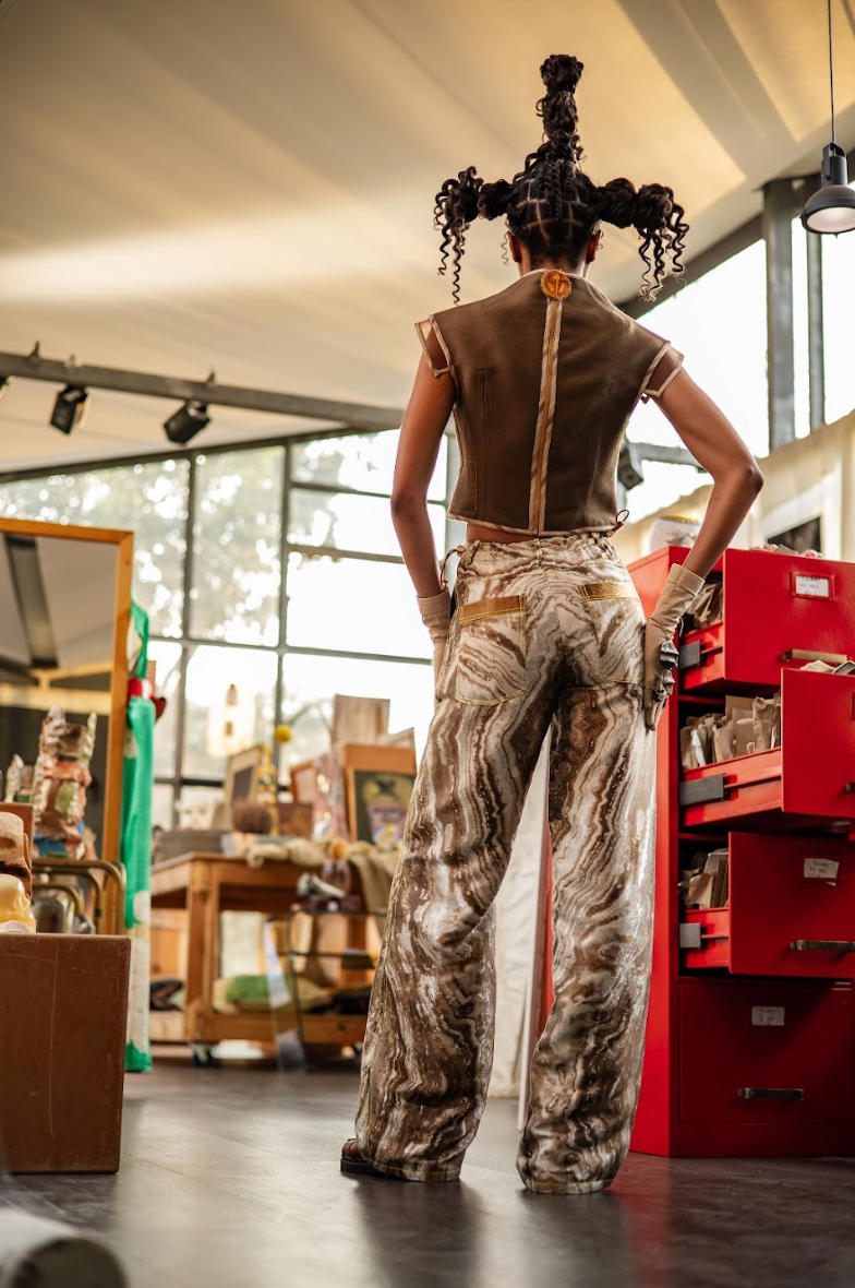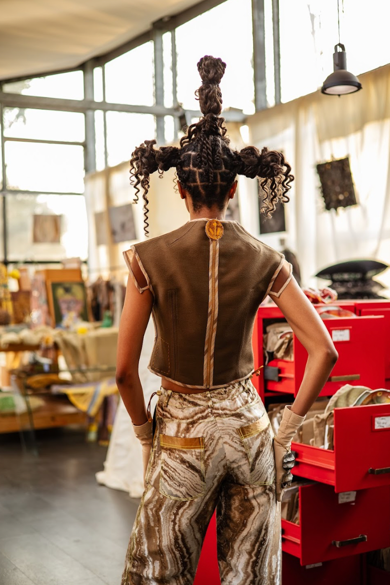 The Mocha Brown Shield Top in Heavyweight wool twill features exposed zibbon shoulder pads, a high neck with a V-cut front, raw overlapped seams, dart details, and hand embroidery, with a back zip closure an hand-embroidered label.
