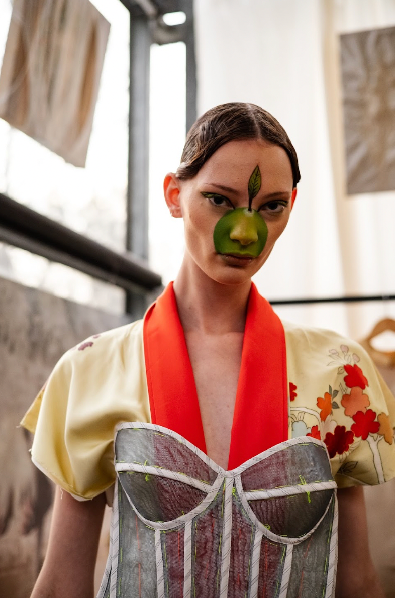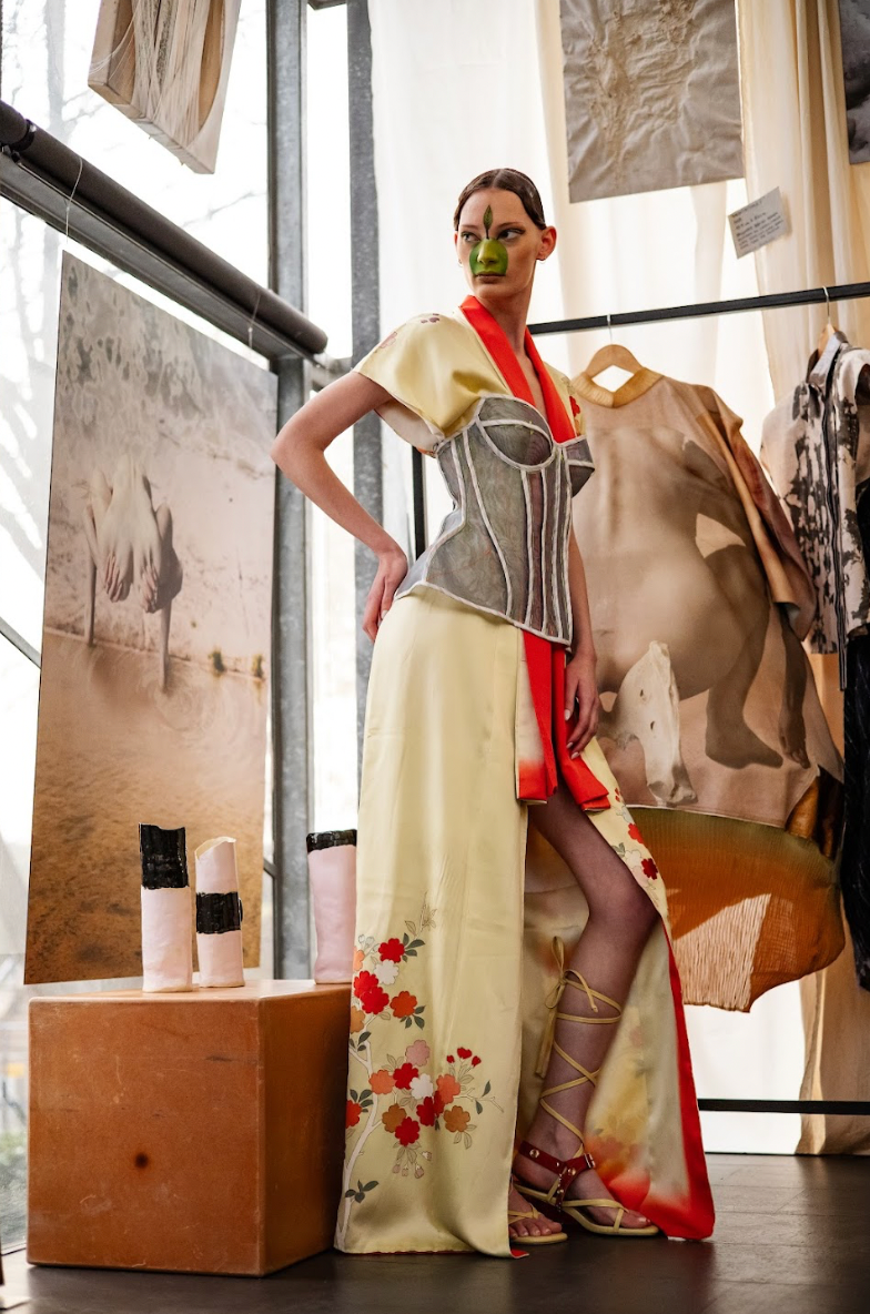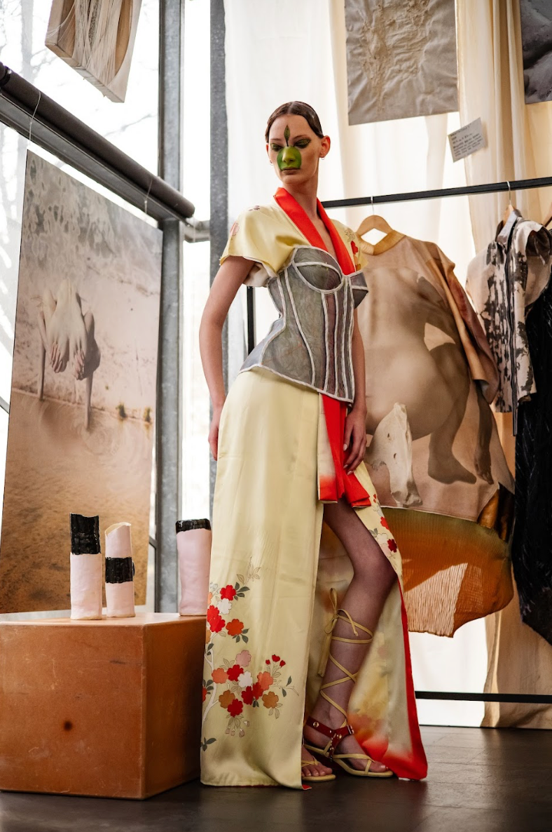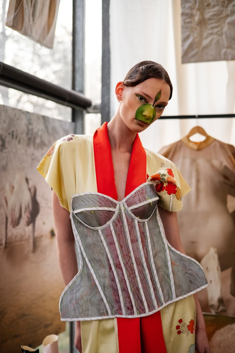 Fabrication: Silver Zibbon Sculpted Corset and Balck and White Check Egyptian Cotton Piping