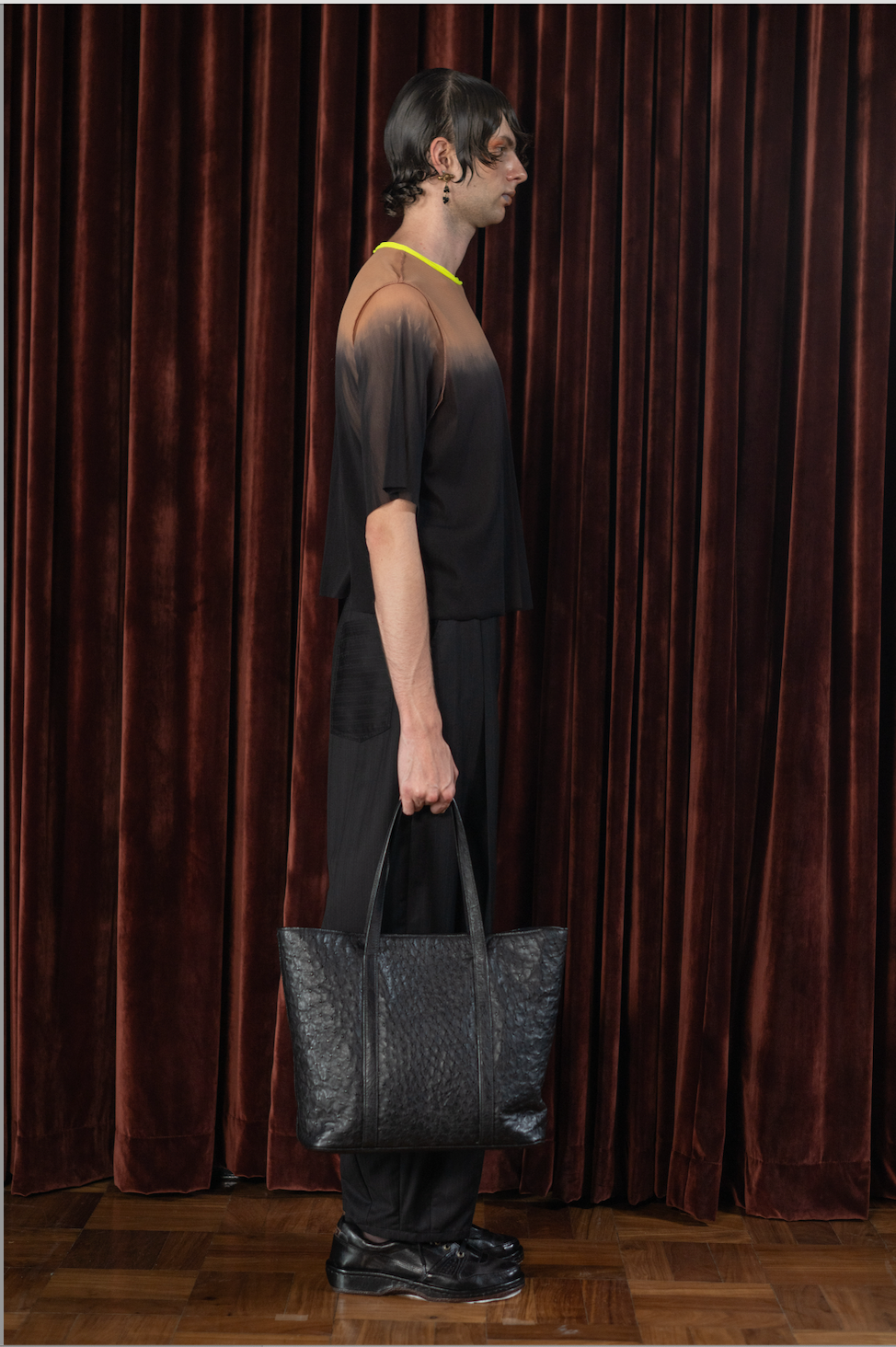 Product Description: Black on Dusty Peach Hand Dyed Stretch Mesh T-Shirt with Dusty Peach Stretch Mesh Lining and Acid Yellow Stretch Mesh Collar.