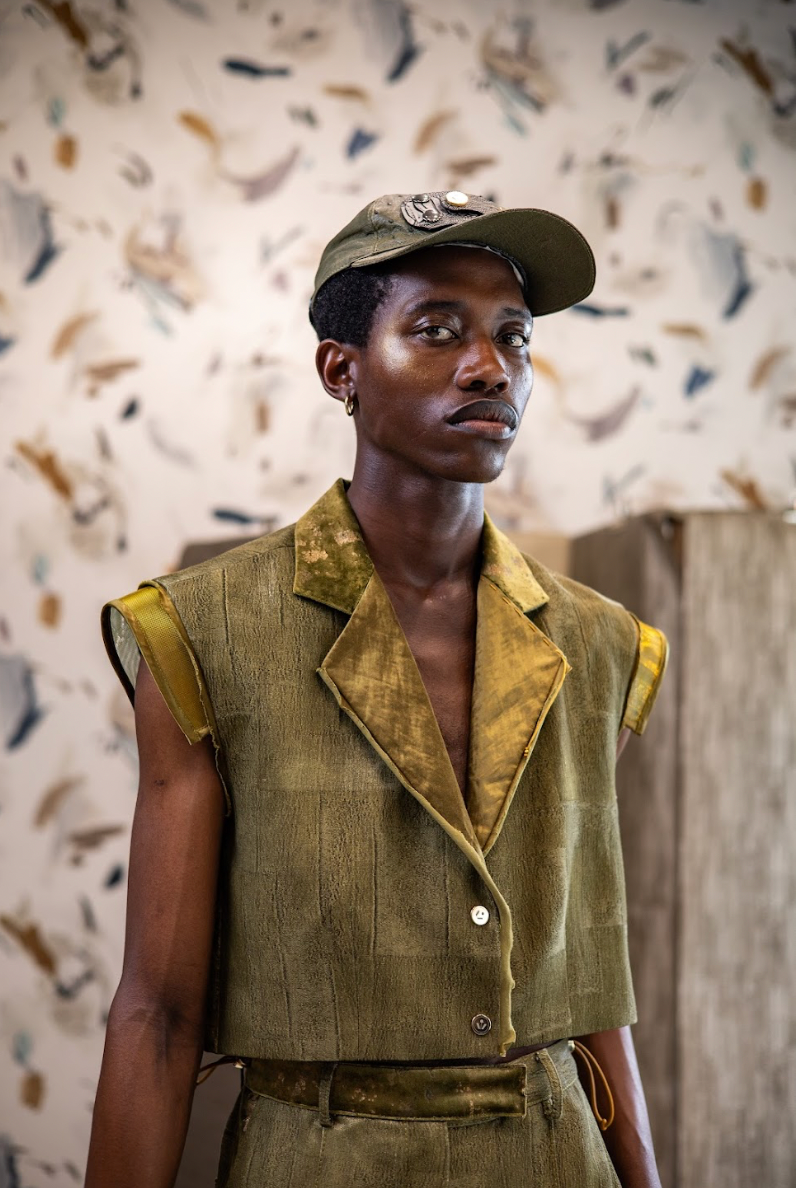 Fabrication: Portland Cypress Viscose Linen Blend, Ledbury Cypress Viscose Cotton Blend, Enzo Olive Cotton Polyester Blend, Reclaimed Ginger Brown Acetate Satin, and Electrum Zibbon
