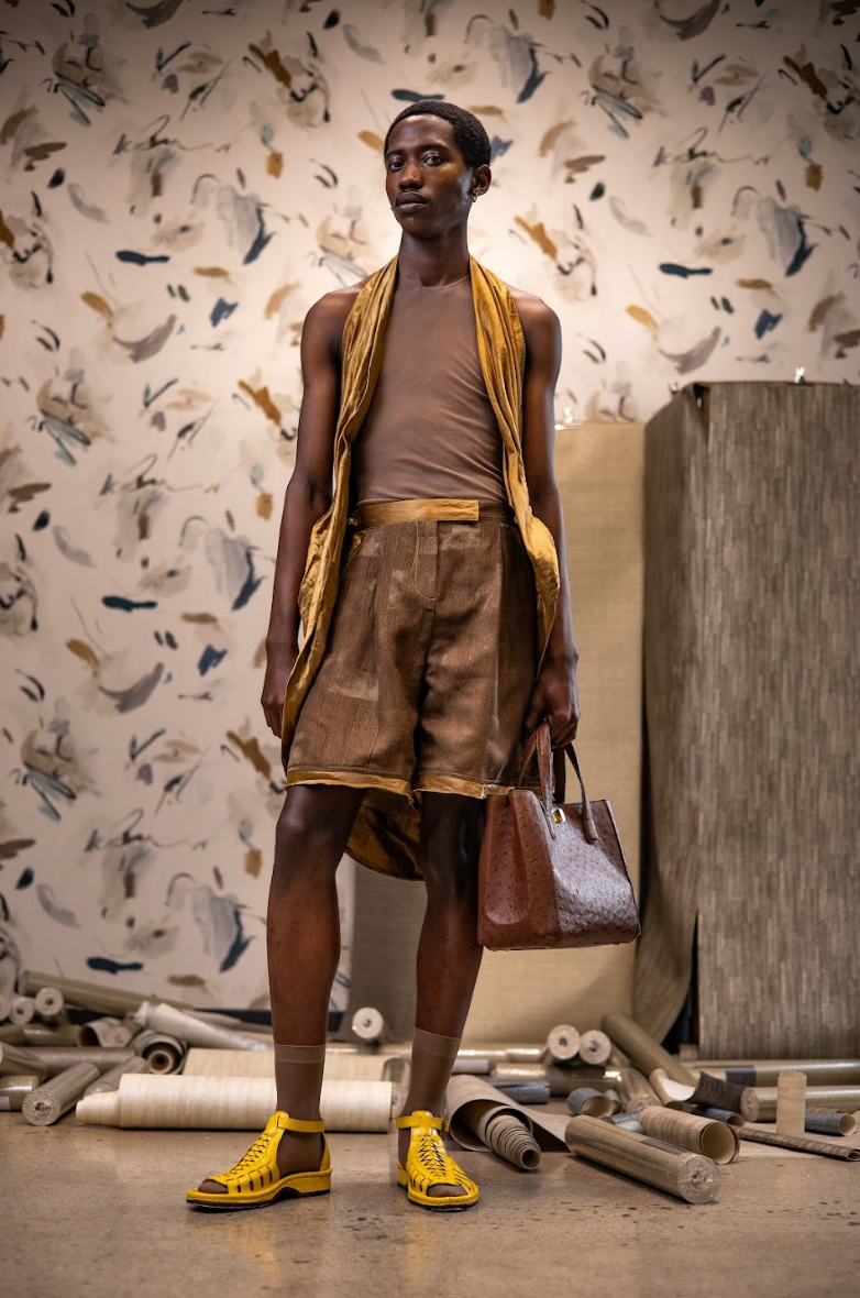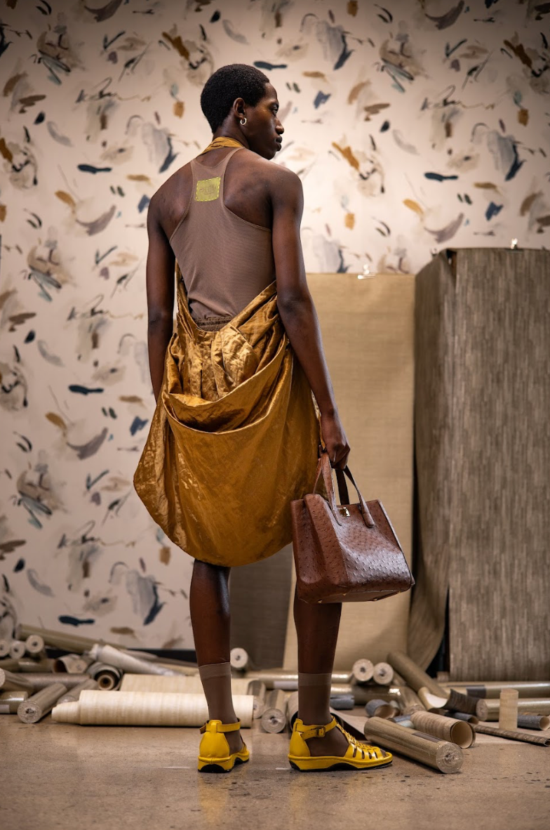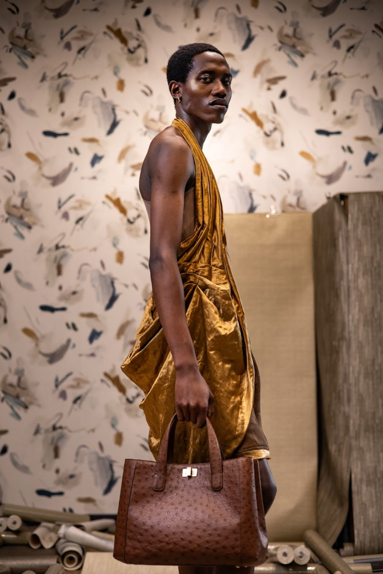 Fabrication: Portland Teak Linen Viscose Blend, Enzo Orient Cotton Polyester Blend, and Caramel Brown Cotton Viscose Twill Lining