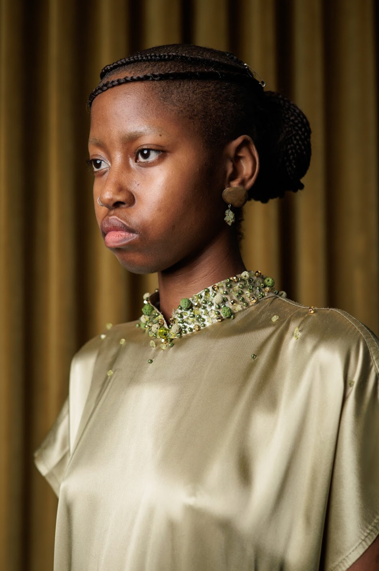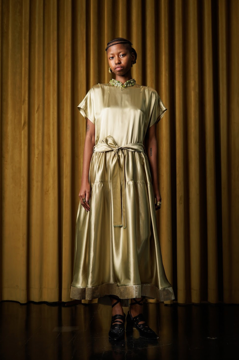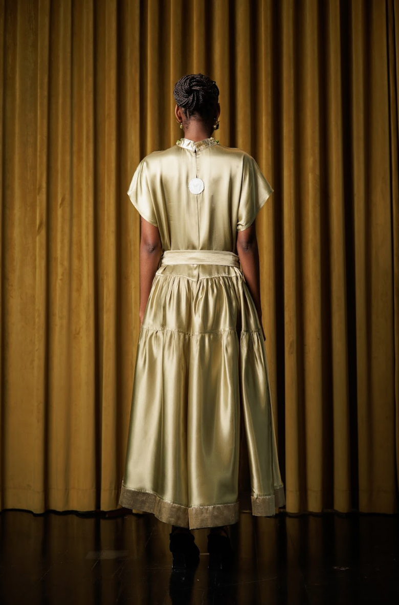 The Reclaimed Green Moss Acetate Satin Signature Qipao Maxi Dress includes a mandarin collar with Beaded Details and is made from 100% green moss acetate. Details include belt loops and a belt to cinch, and a centre back pleat that allows this piece to be styled flared and drape over the body organically.
