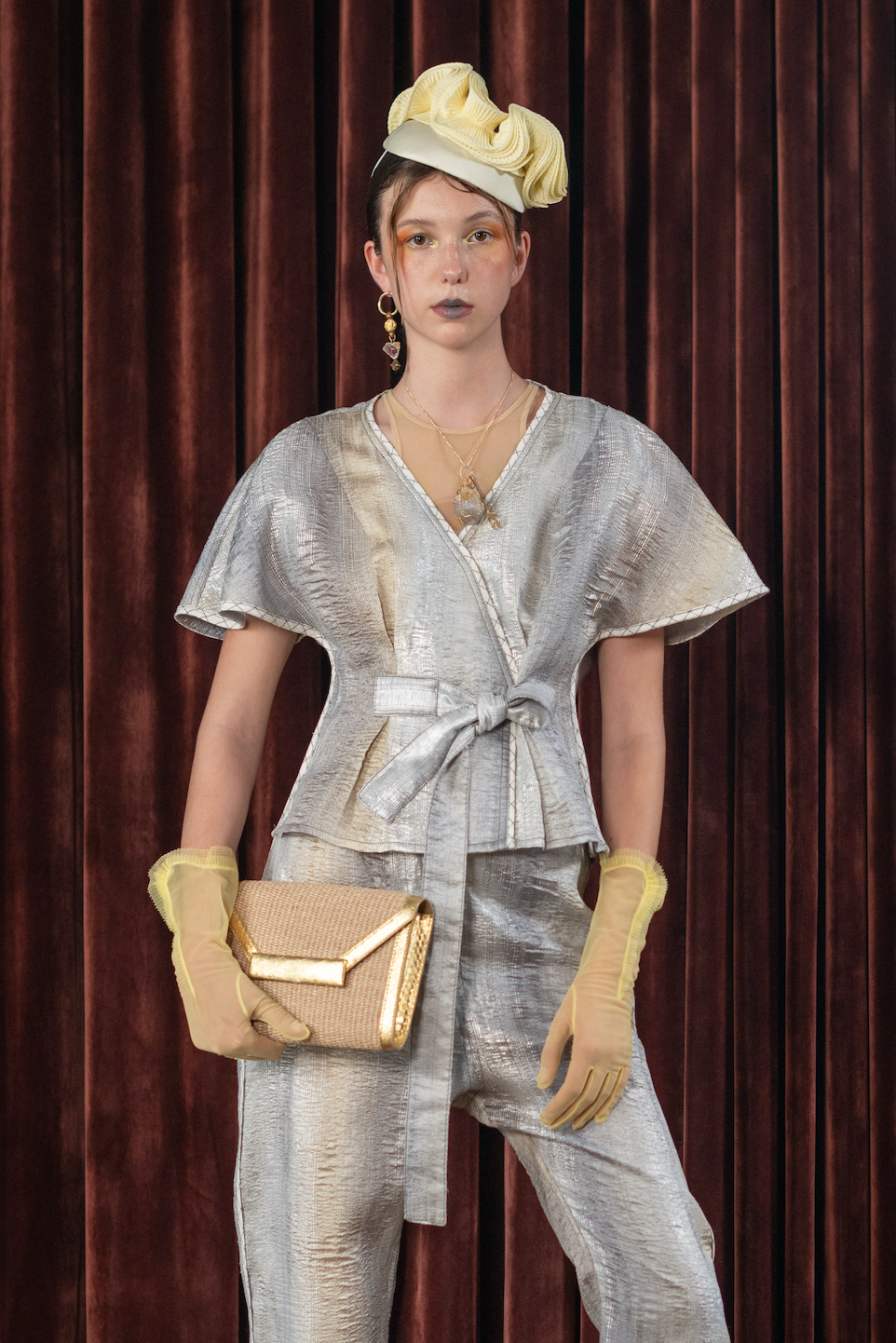 Wrap top crafted from silver and grey kaleidoscopic brocade, featuring piping details throughout. Designed with a wrap and tie closure, accented with Italian hardware for a refined finish. Constructed with dolman sleeves, inverted box pleats, French seams, and bound seams. Finished with a hand-embroidered logo.