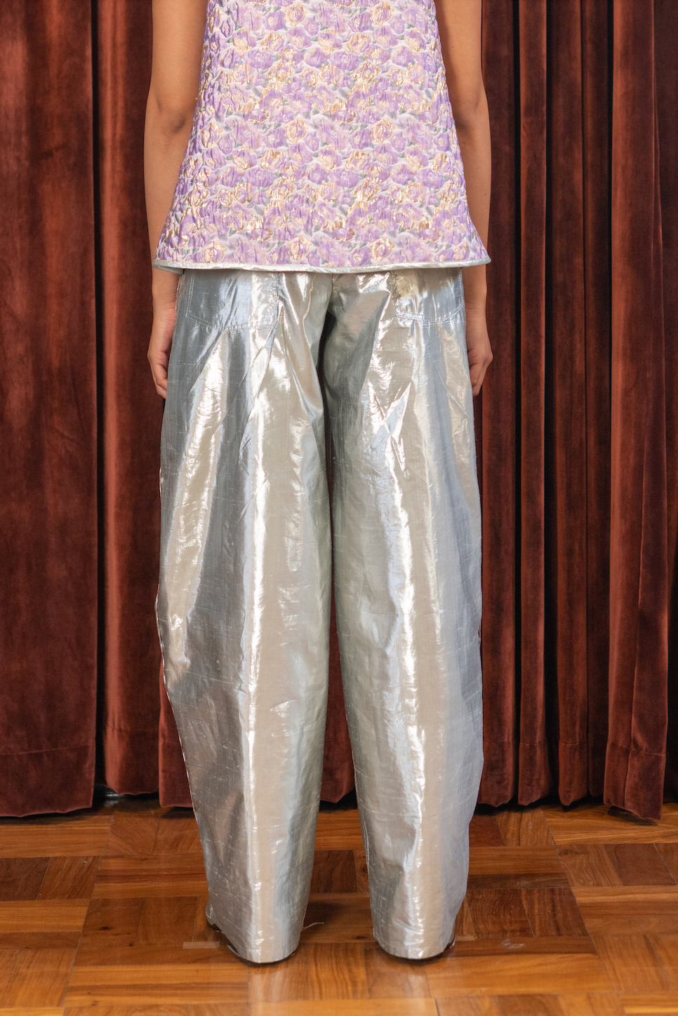 The Water Caustics Signature Pants in Silk Lamé are crafted from vintage aquamarine silk lamé with brown etched ostrich shin leather details, brown and white check Egyptian cotton piping and seafood green acetate taffeta pocketing. These pants are finished with Italian hardware.